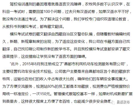 “2014年初,由于驾校经营不善,单位欲把驾校卖出去。但是,我认为汽车驾校实际上很有前途,有发展潜力。于是,下决心自己筹资承包驾校,单位里原有的10名员工也愿意跟着我一起干,从那时我就成为真正的驾校主管。最近几年,昌都地区的私家车辆增长很快,无论城市居民还是农牧民都纷纷)。